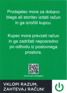 Obvestilo o obveznosti izdaje računa in izročitve računa kupcu ter obveznosti kupca, da prevzame in zadrži izdani račun: Prodajalec mora za dobavo blaga ali storitev izdati račun in ga izročiti kupcu. Kupec mora prevzeti račun in ga zadržati neposredno po odhodu iz poslovnega prostora.
